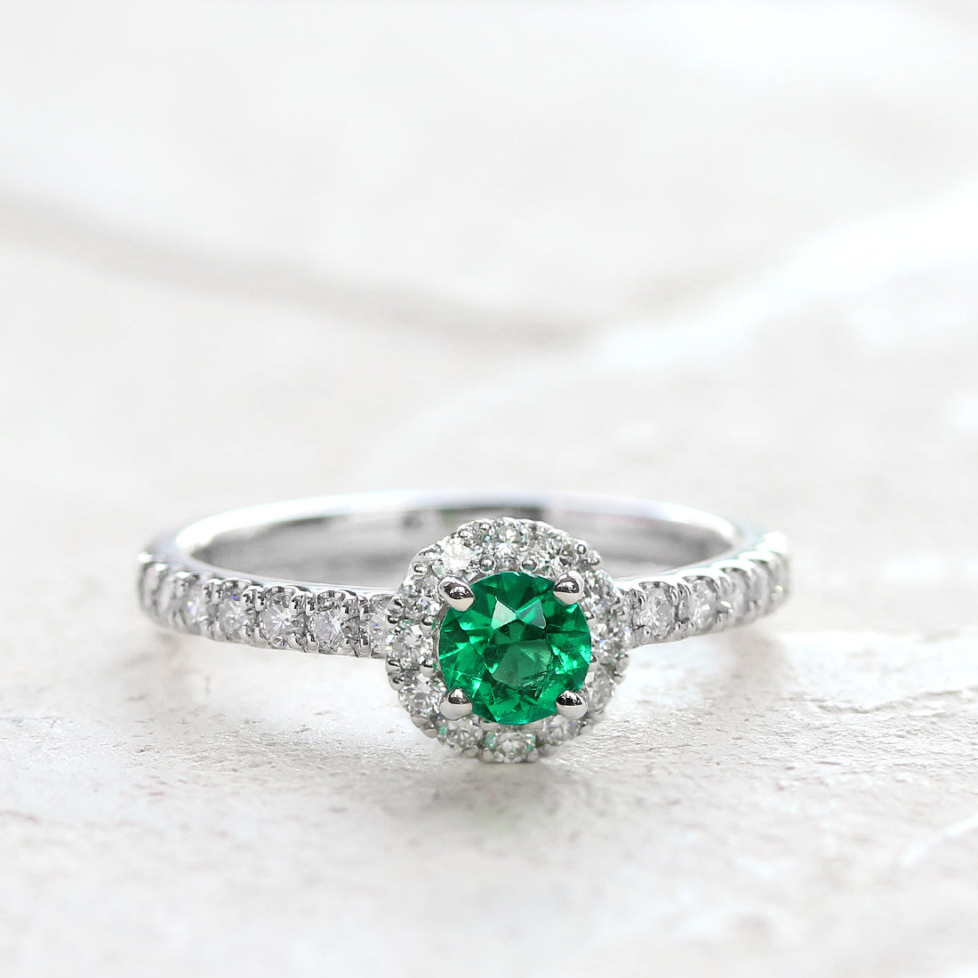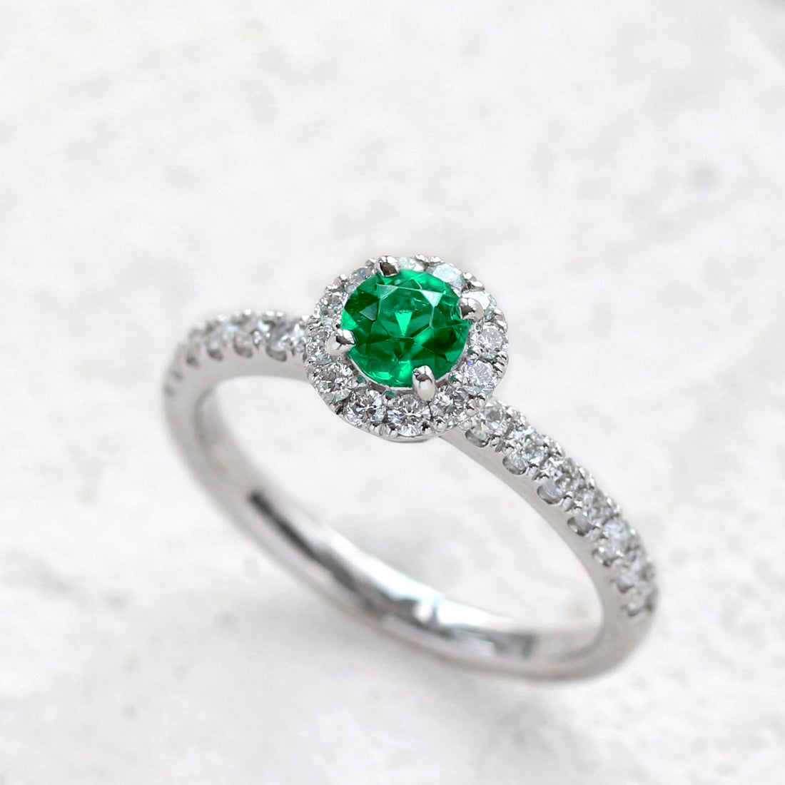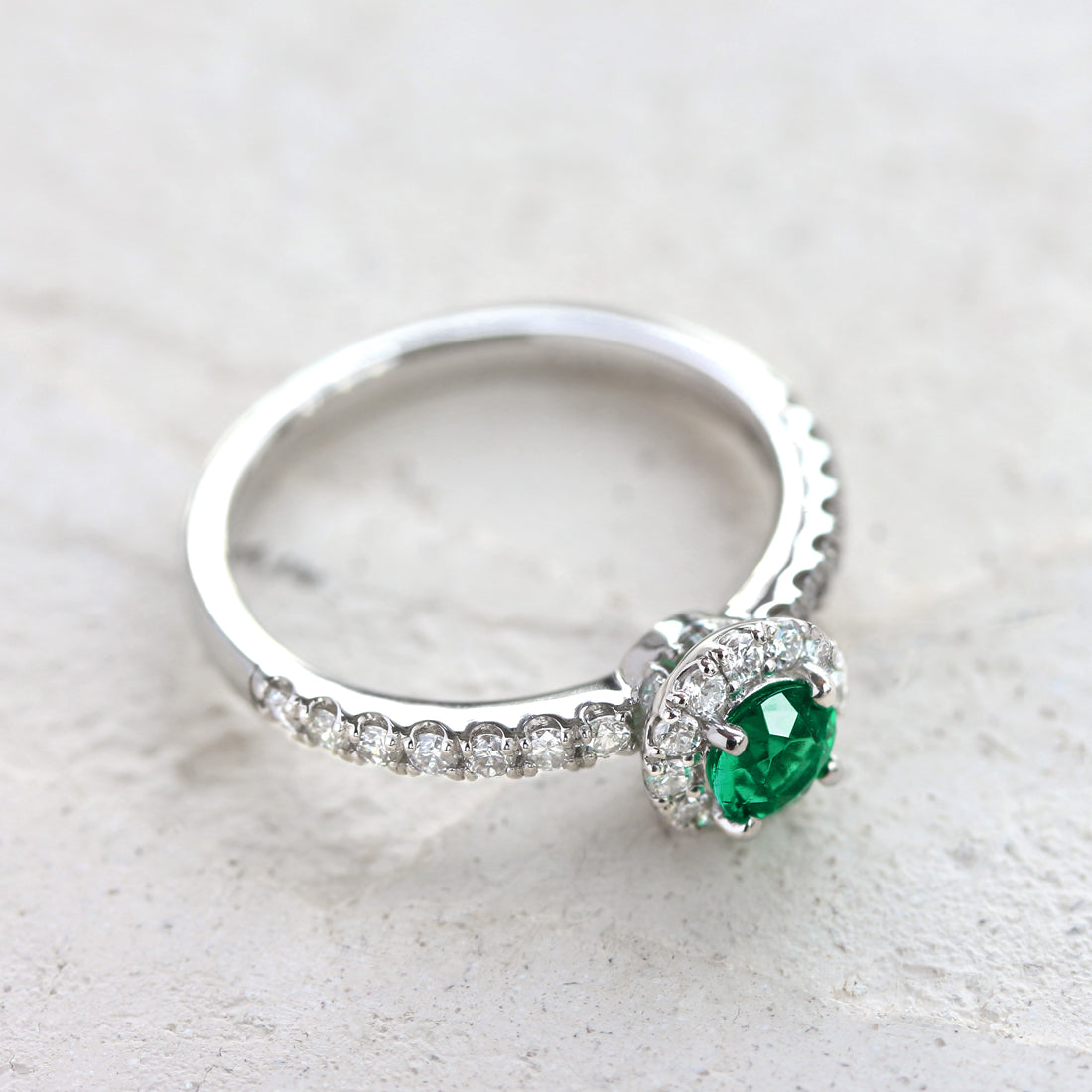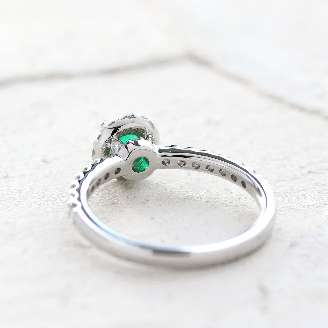 鮮やかな青緑色が印象的なエメラルドを主役に、メレダイヤモンドで取り巻いたヘイローリング。