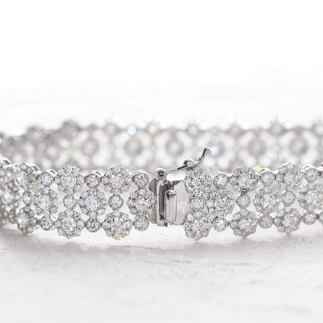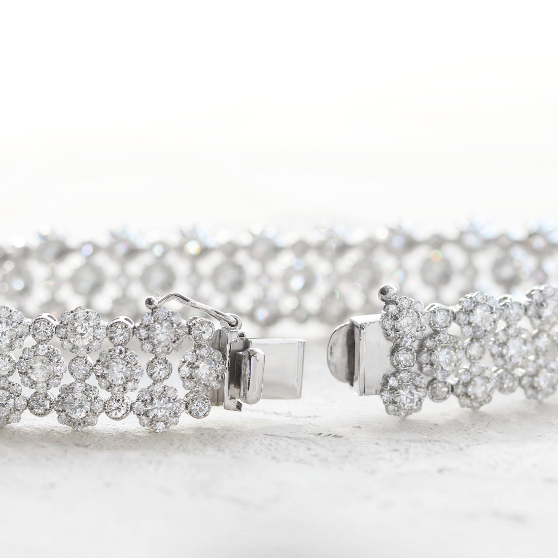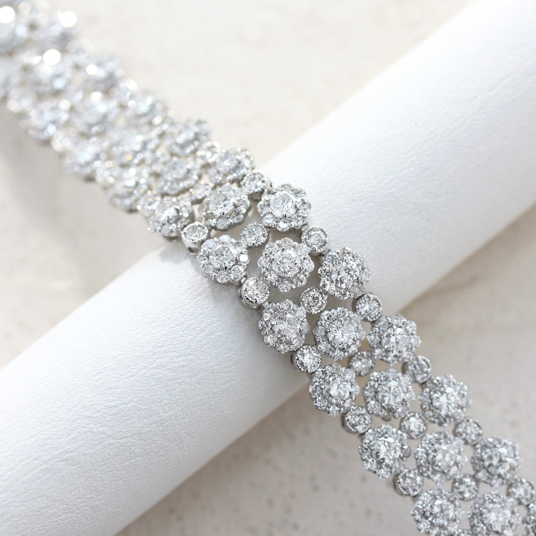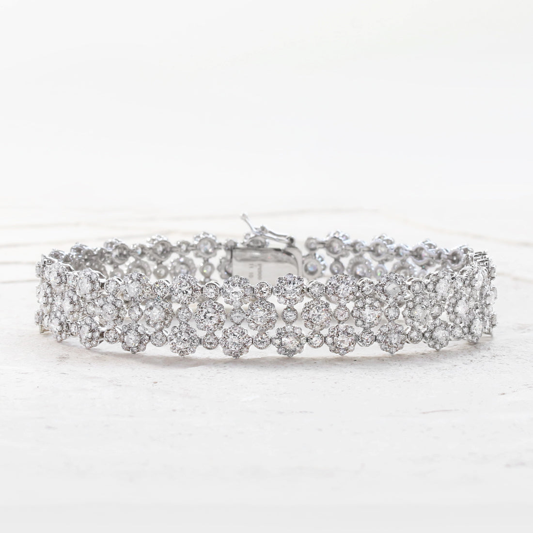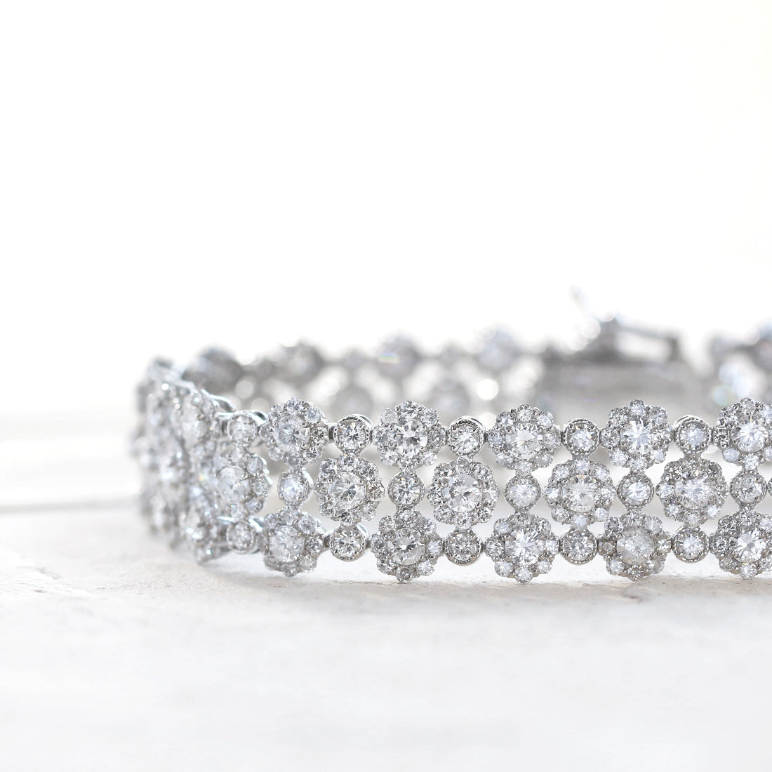 まるで満開の花々が手元を彩るかのように、繊細なフラワーモチーフが連なるフルダイヤモンドブレスレット。