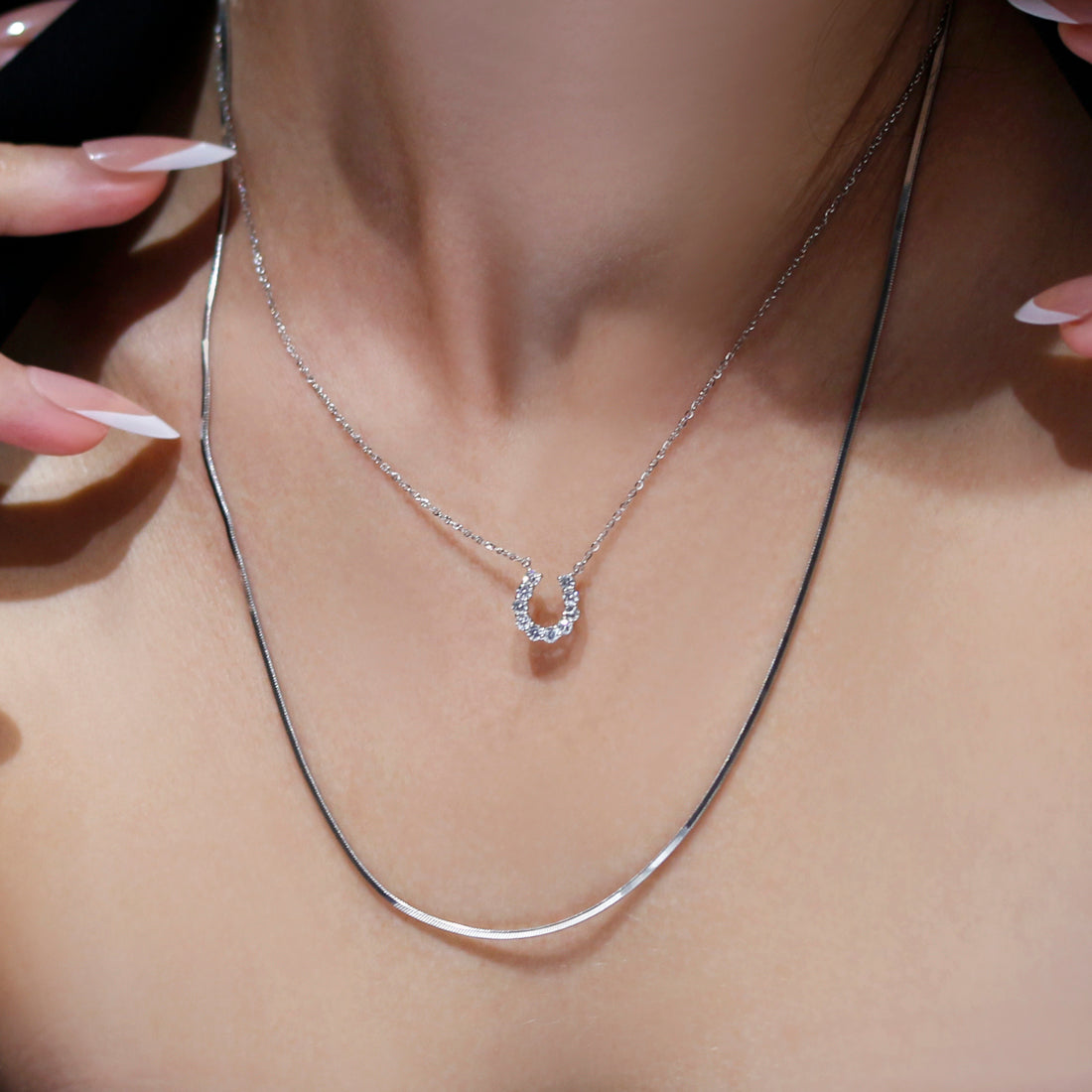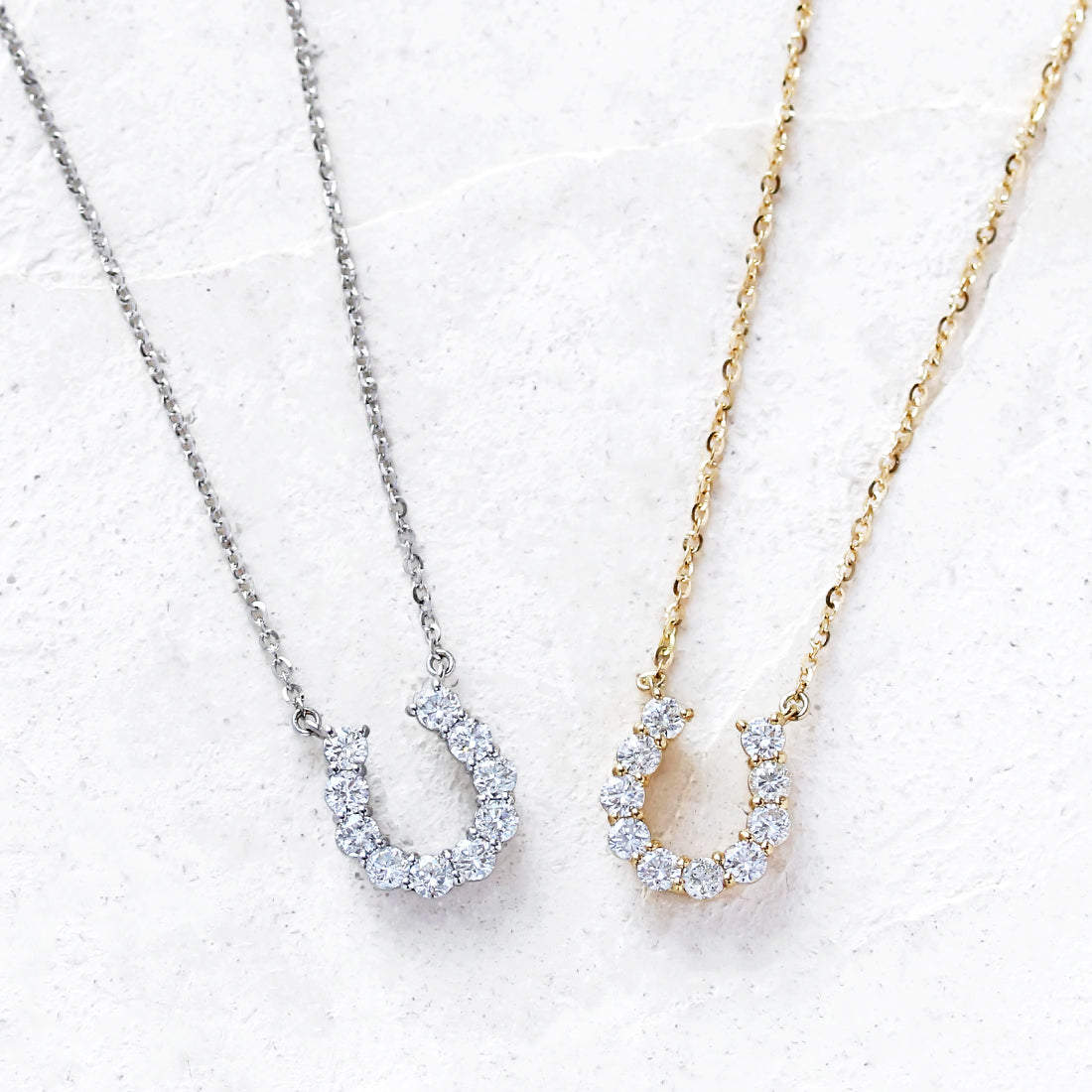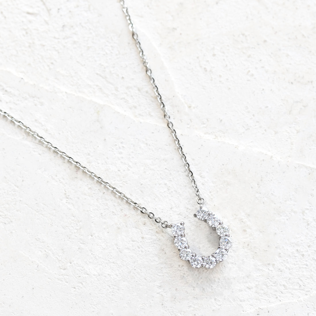 洗練された馬蹄モチーフが胸元で輝くダイヤモンドネックレス。