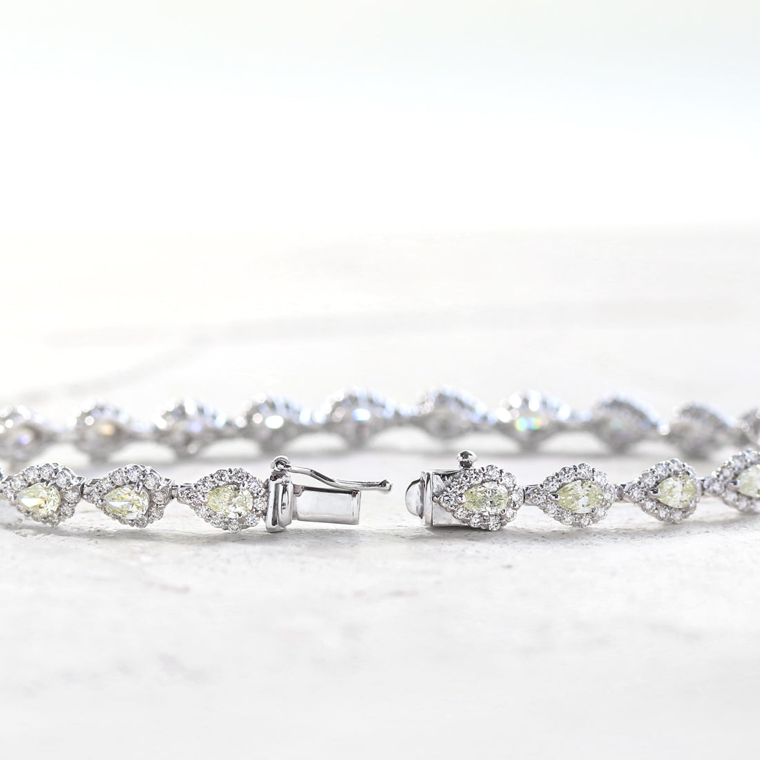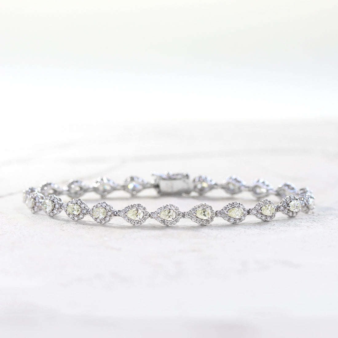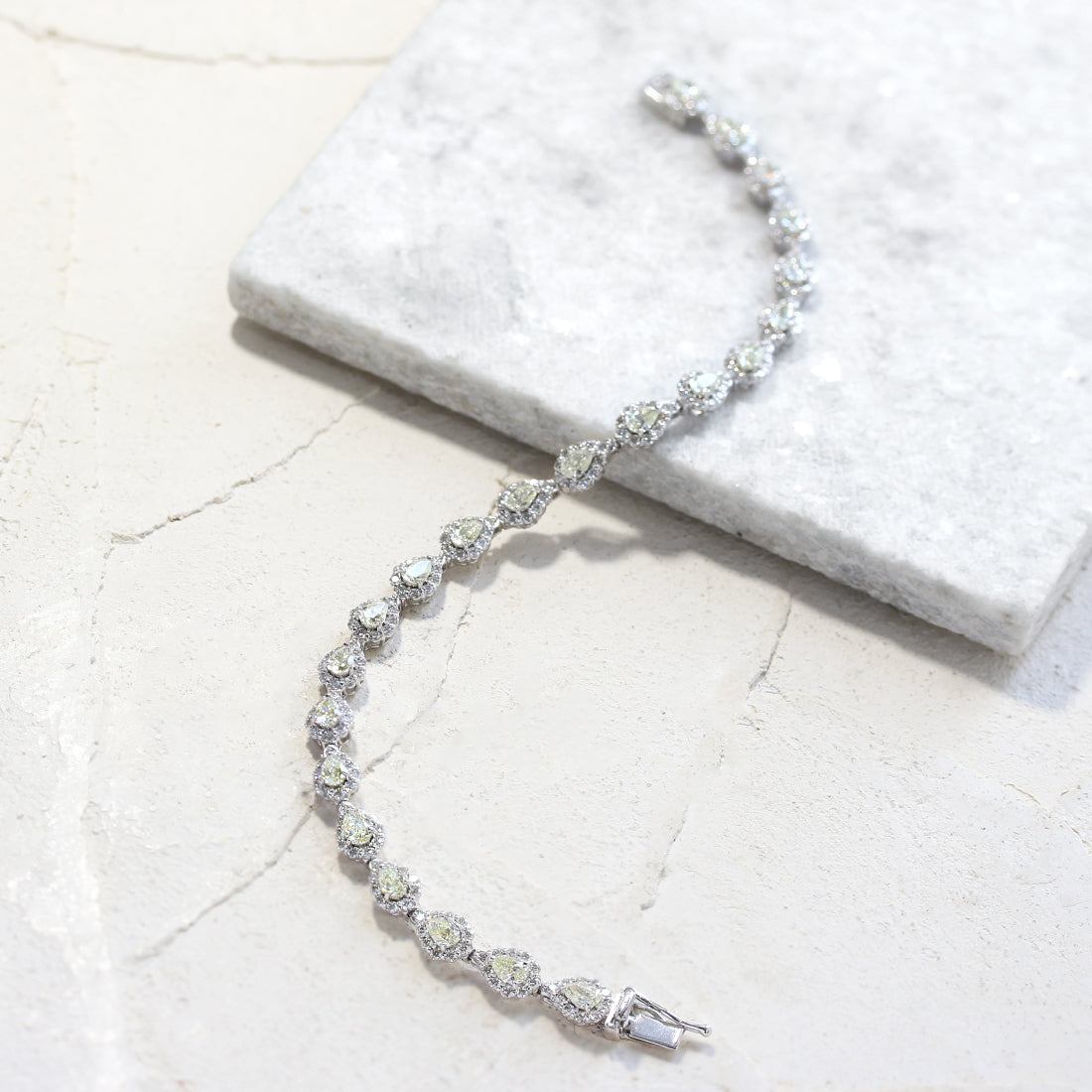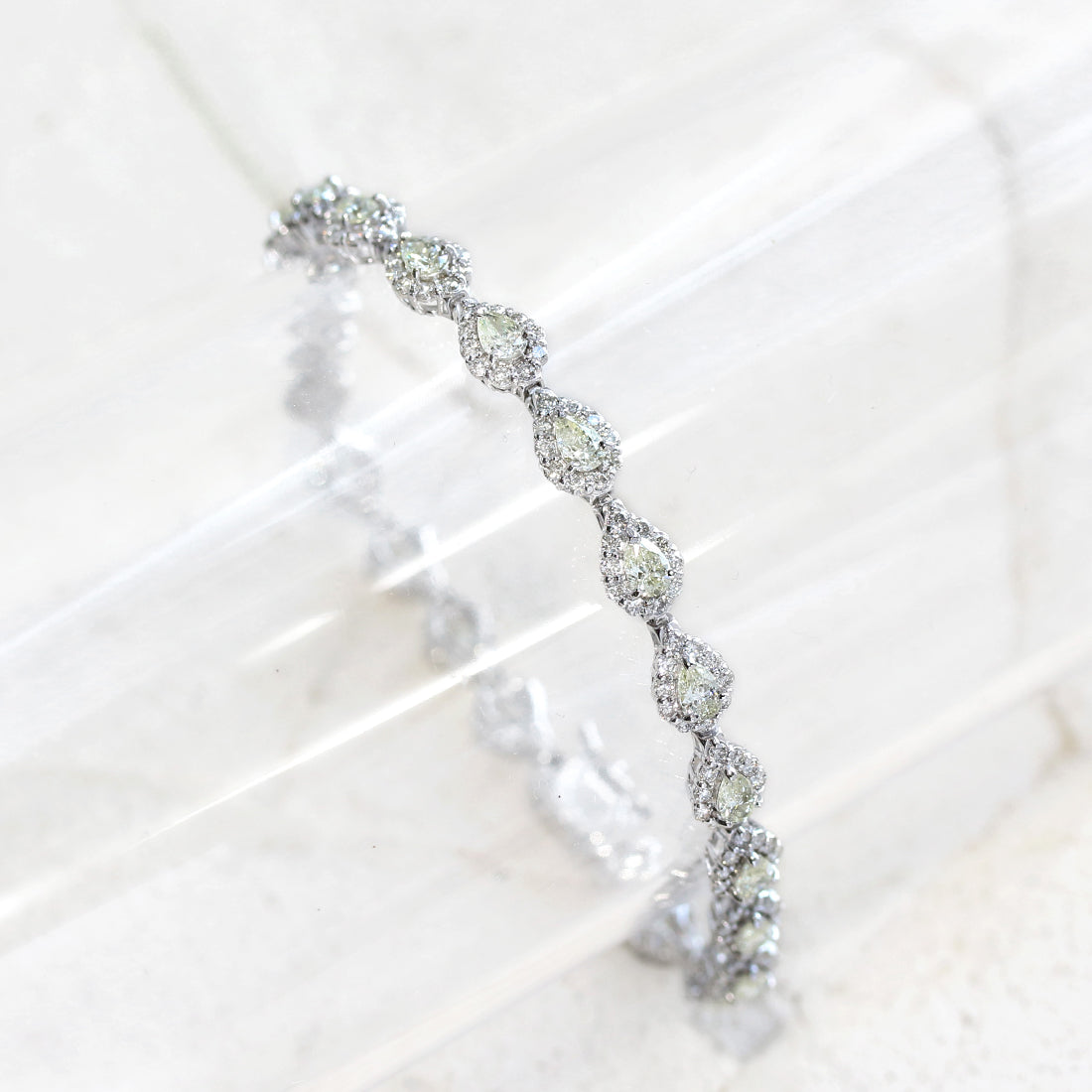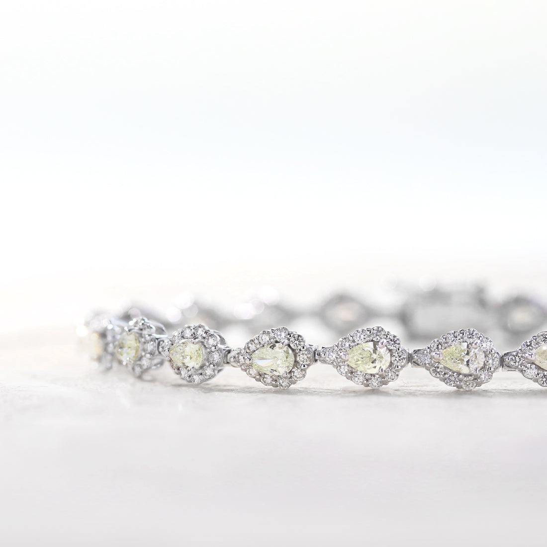ふんわりとイエローを纏ったペアシェイプカットダイヤモンドを贅沢に連ねた、極上フルダイヤモンドブレスレット。