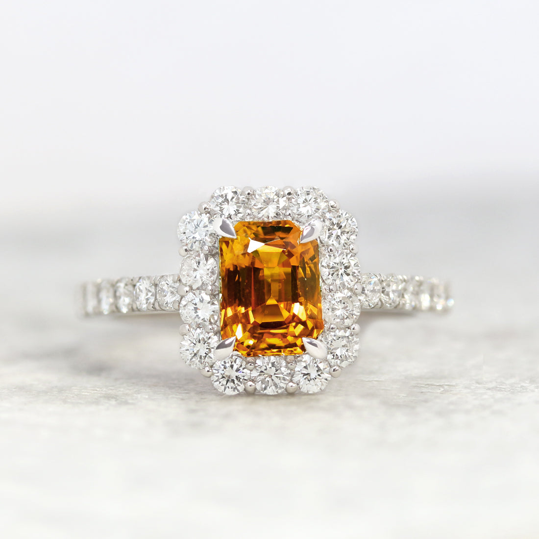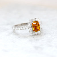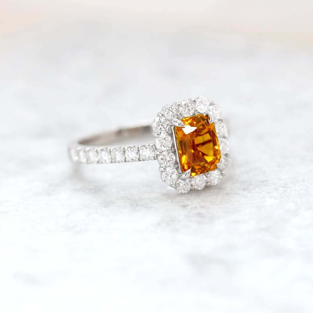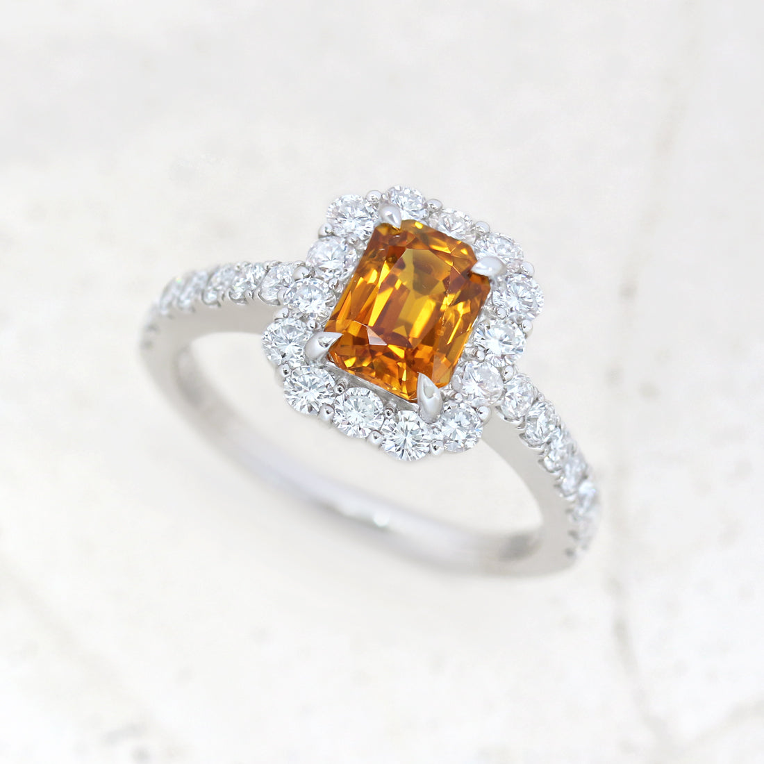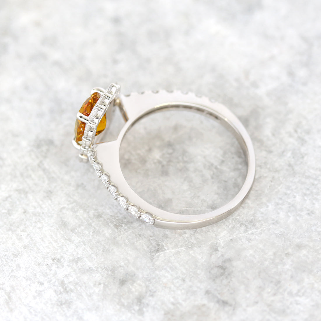 すっきりとした透明感のメレダイヤが、オレンジサファイアの存在感を引き立てます。