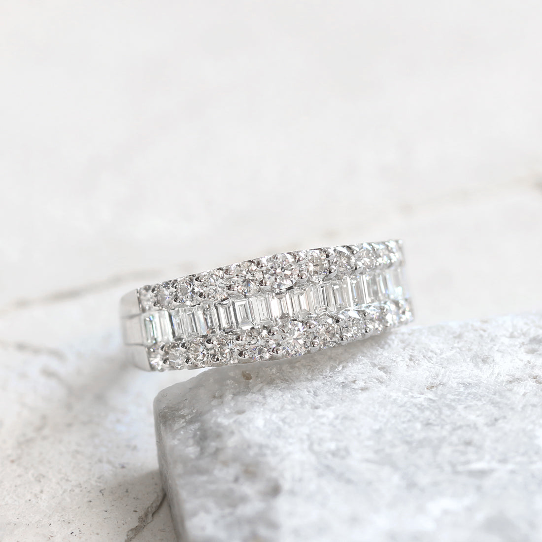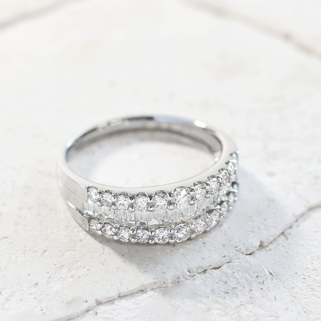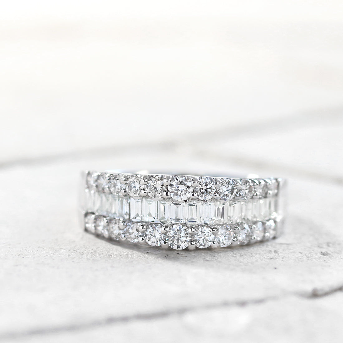 丁寧に並べられたバゲットカットダイヤモンドのシャープな美しい光と、その両側を取り巻くラウンドカットダイヤモンドのはじけるような煌めきが、リズミカルで立体的な輝きを奏でます。