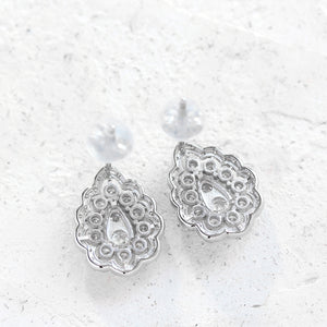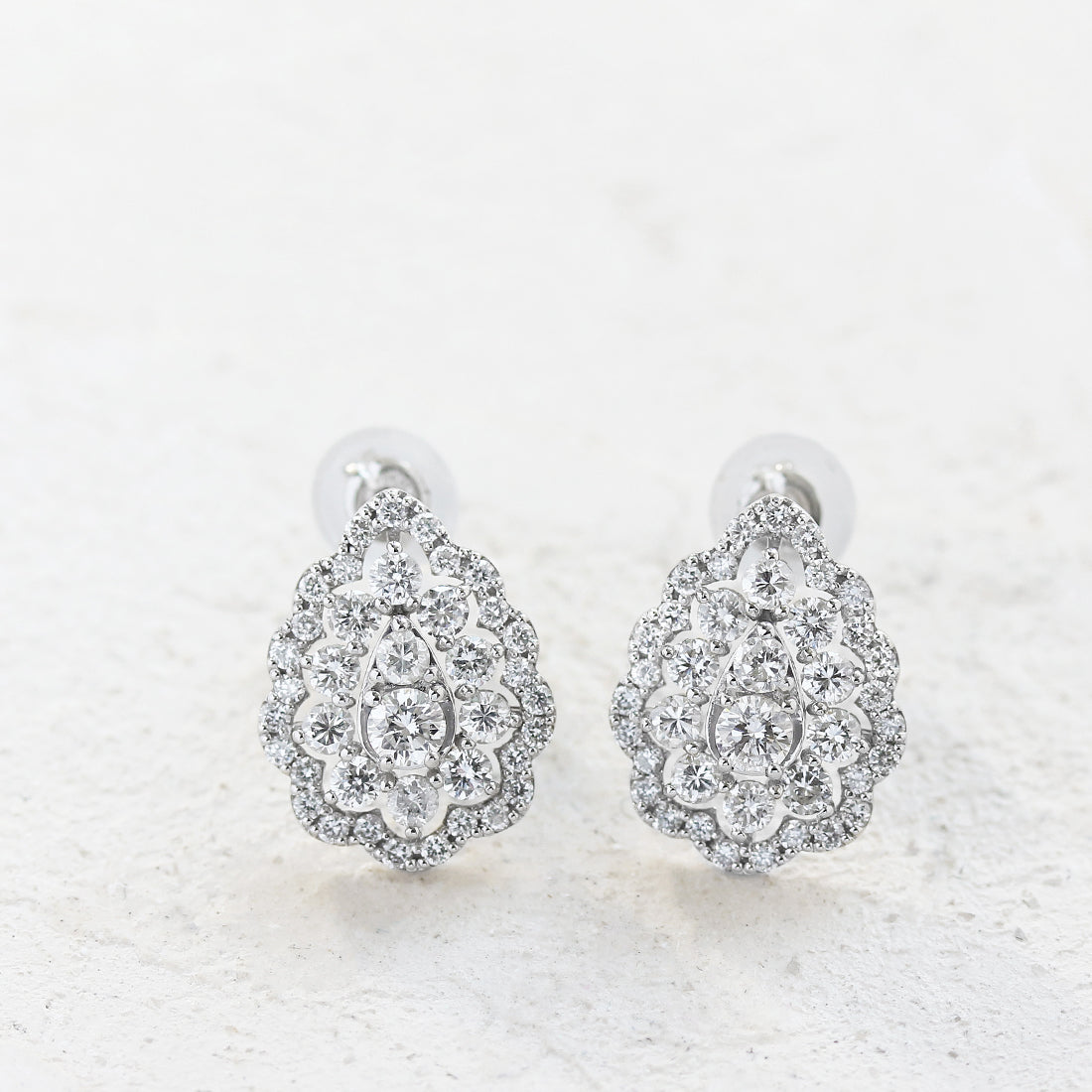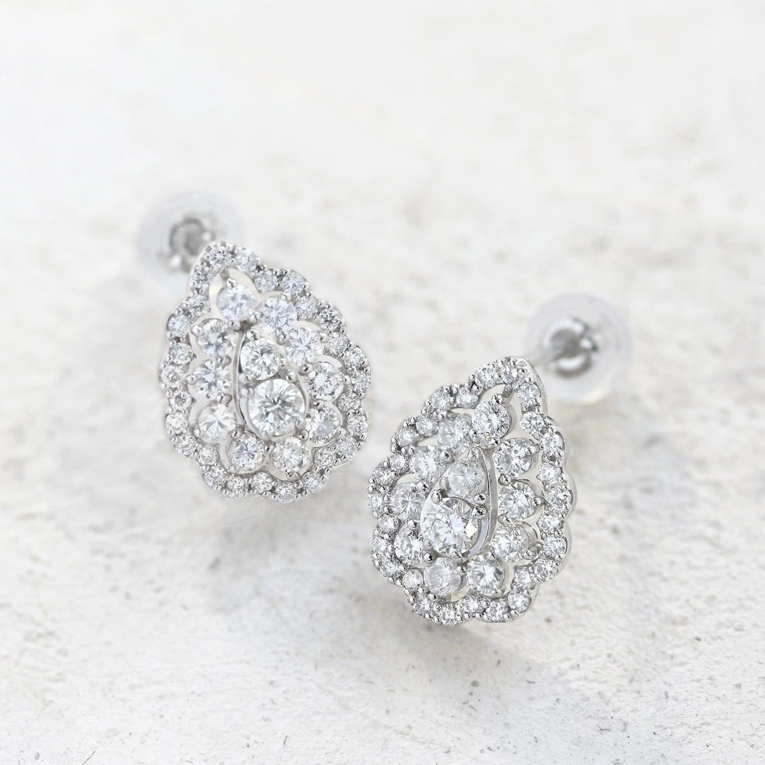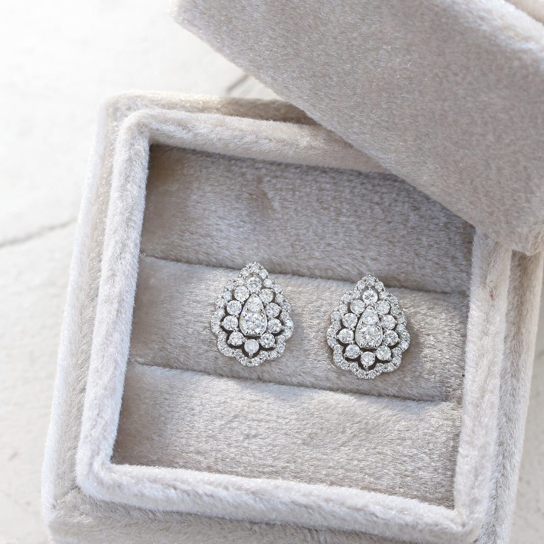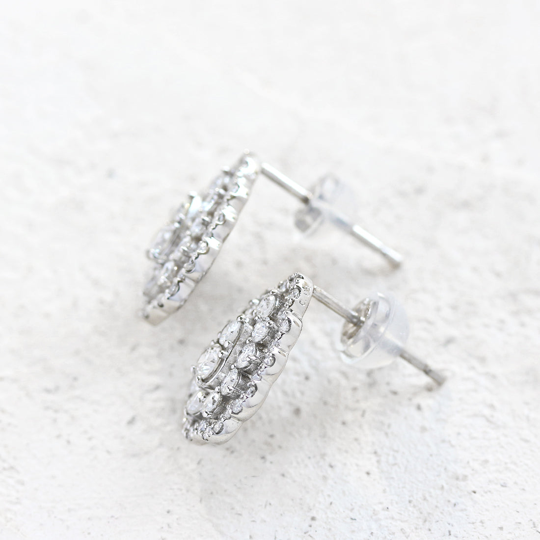 スカラップで縁取ったしずく型フォルムにダイヤモンドが優雅に煌めき、しっかりとした存在感で耳元を華やかに演出します。