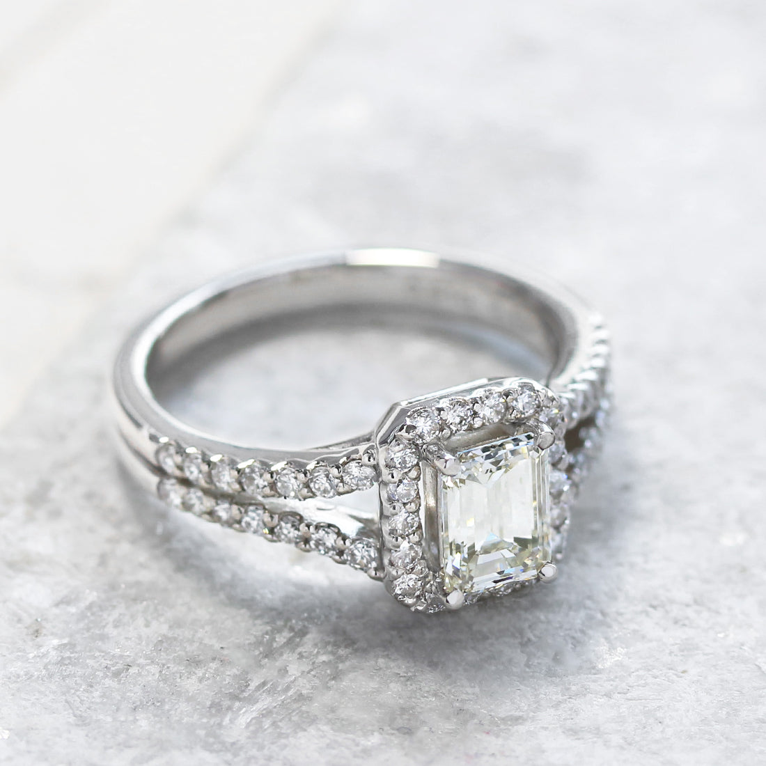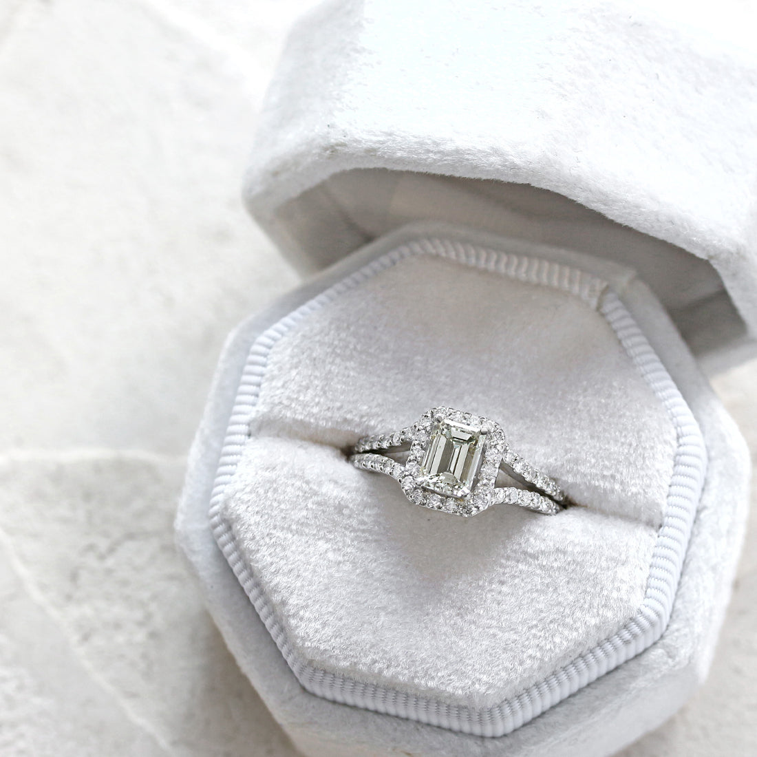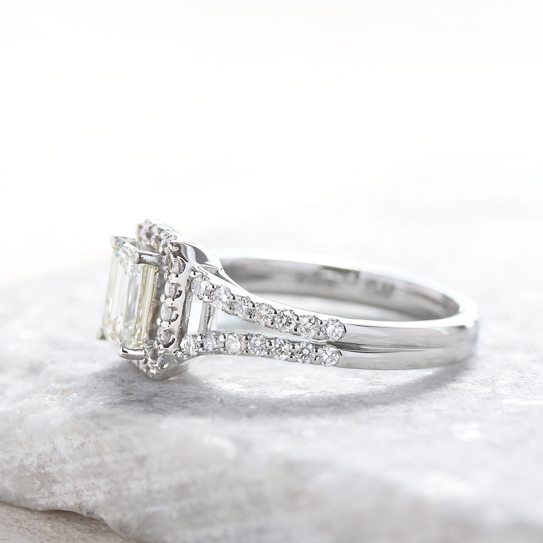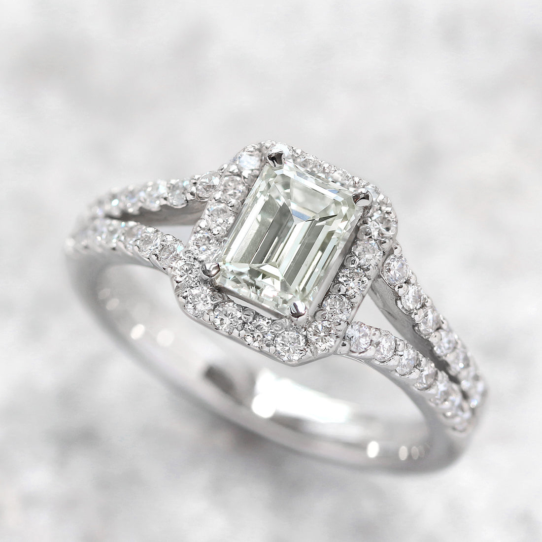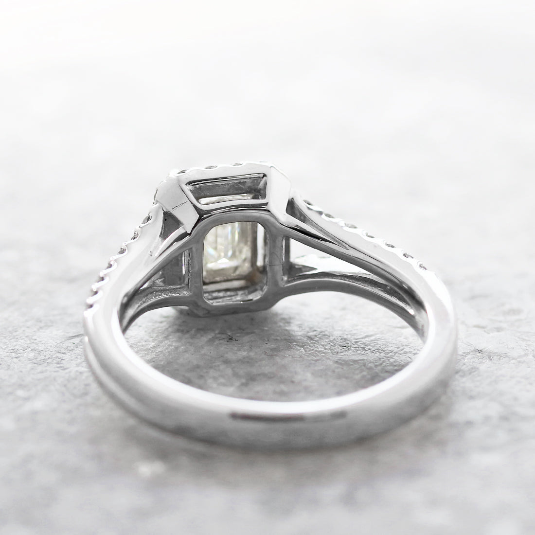 センターに配されたエメラルドカットダイヤモンドのシャープなカットが生み出す、幾重にも重なる“光の回廊”が印象的です。