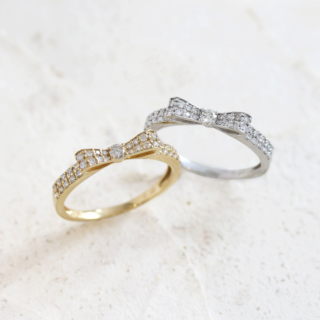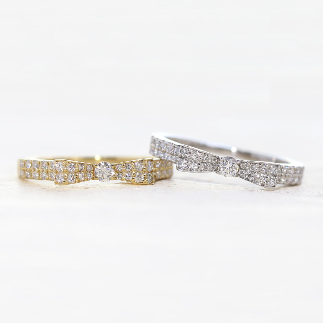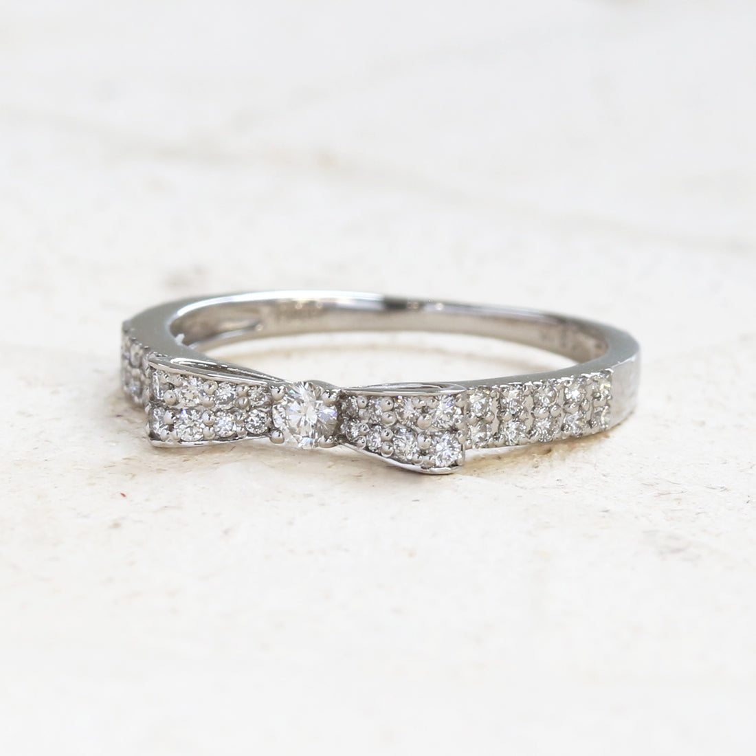 と透明感溢れる輝きを魅せてくれるダイヤモンドが敷き詰められており、どの角度から見ても常に間無く輝き、非常に美しい逸品です。 センターに施されているリボンのデザインが凛とした、女性らしい演出します