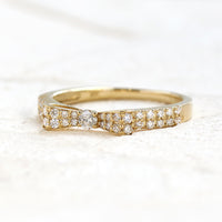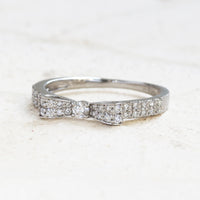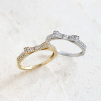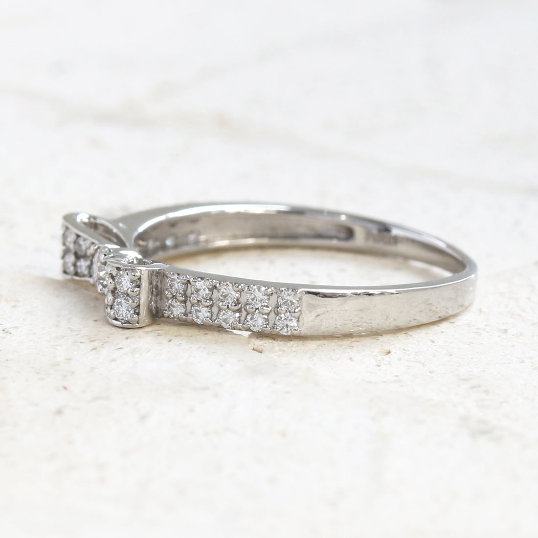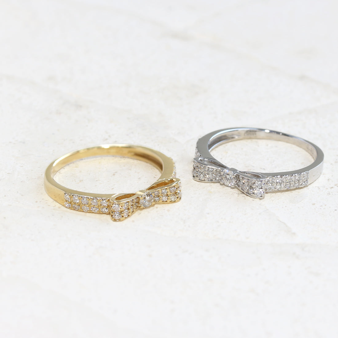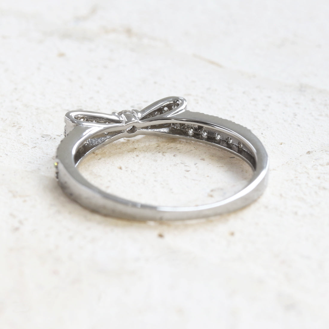 と透明感溢れる輝きを魅せてくれるダイヤモンドが敷き詰められており、どの角度から見ても常に間無く輝き、非常に美しい逸品です。 センターに施されているリボンのデザインが凛とした、女性らしい演出します