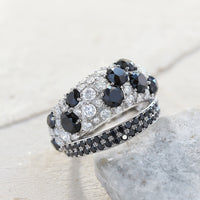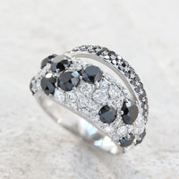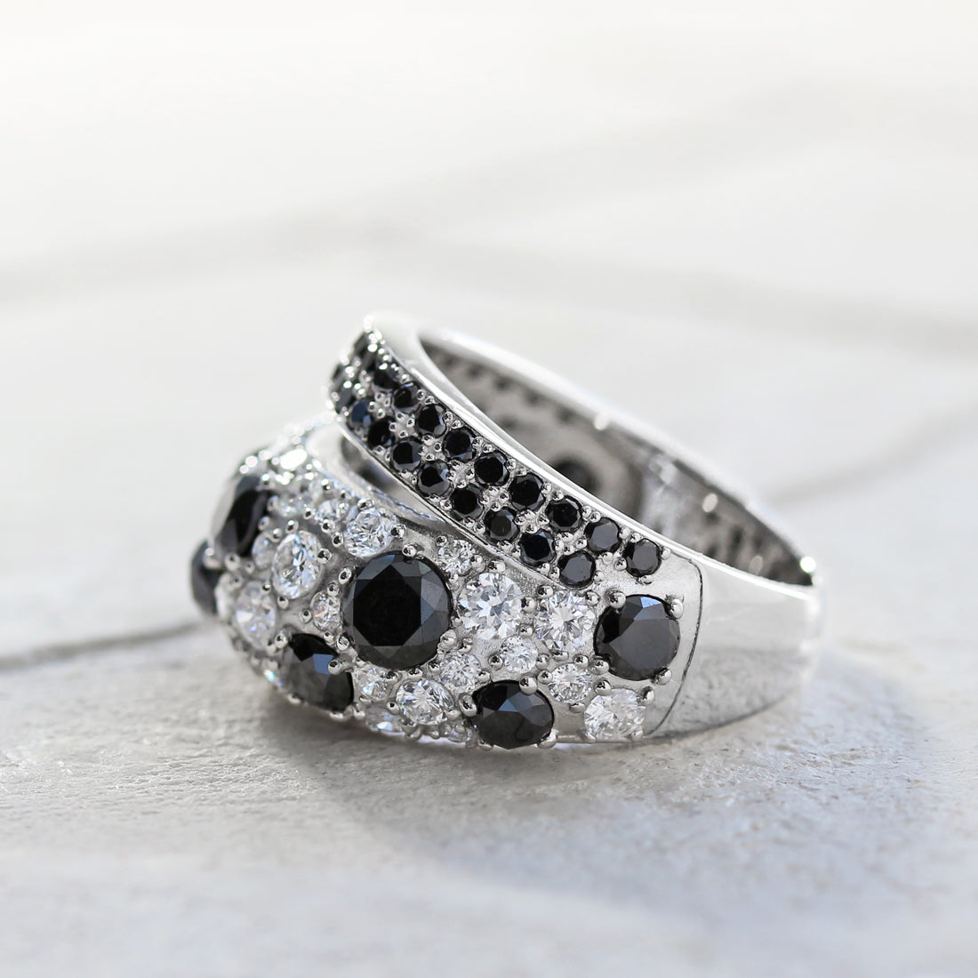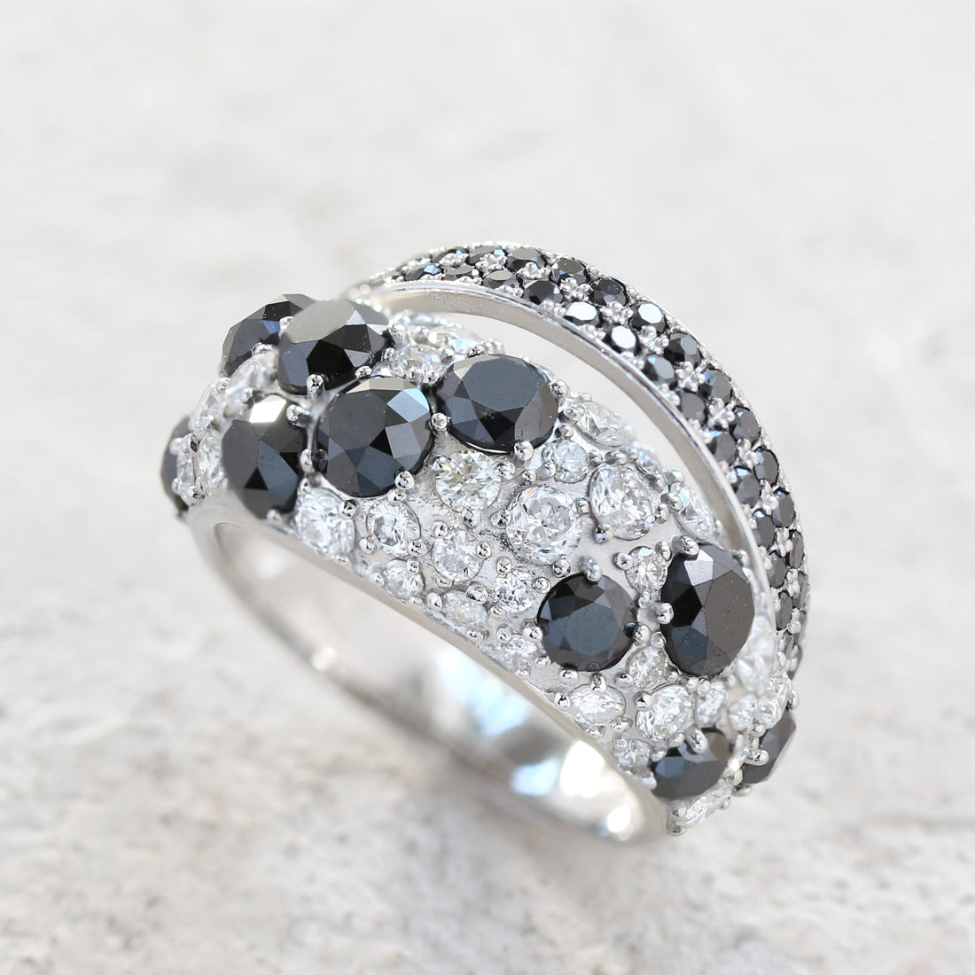 漆黒の艶めきとアシンメトリーなフォルムが、圧倒的なインパクトを放つブラック×ホワイトダイヤモンドリング。