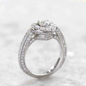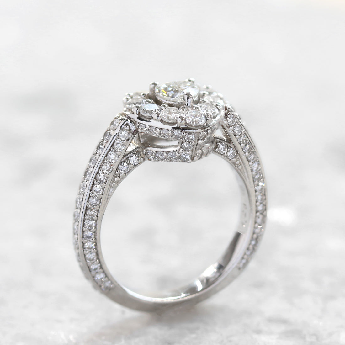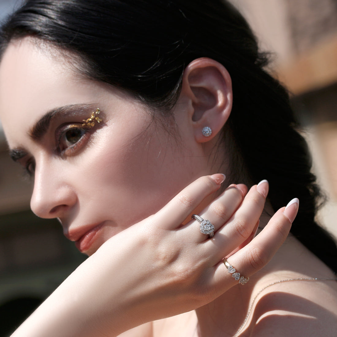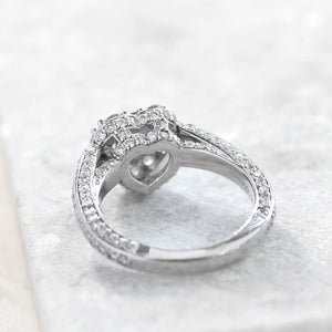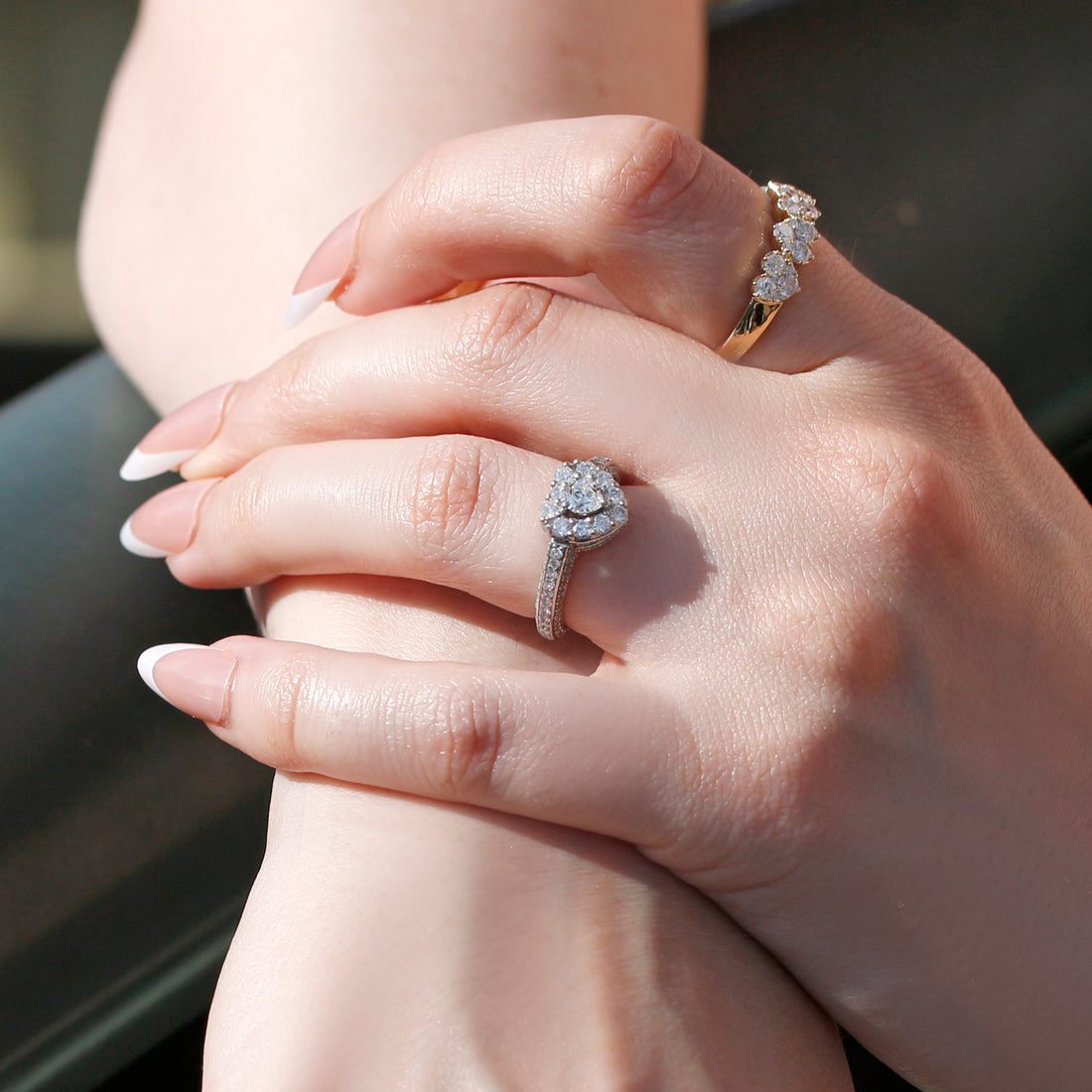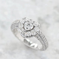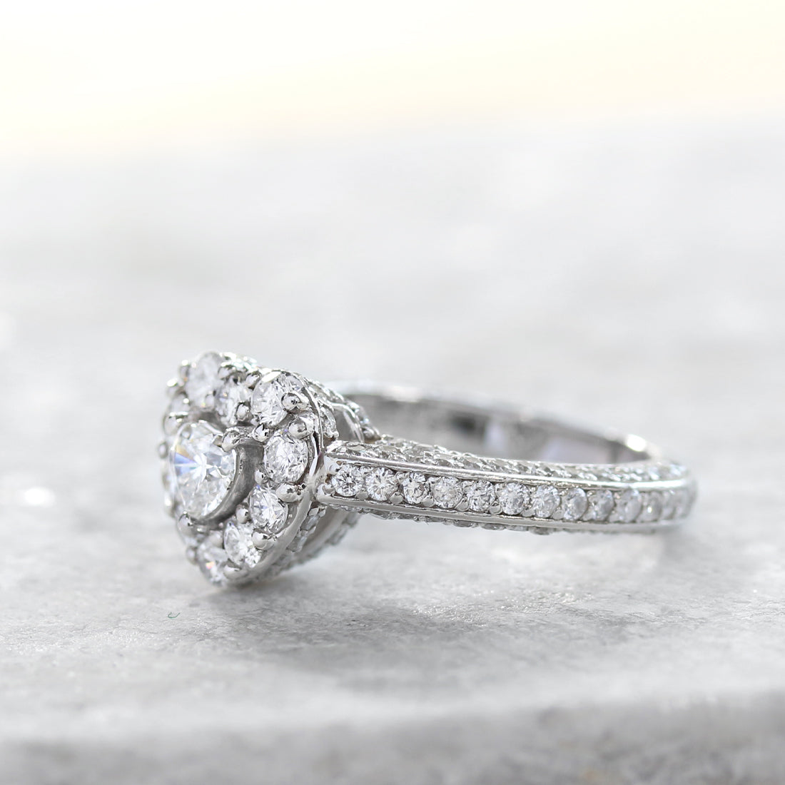 センターで凛と佇むハートシェイプカットダイヤモンドをメレダイヤモンドでさらに取り囲み、キラキラと絶えず煌めく、ロマンチックな輝きに心が躍ります。