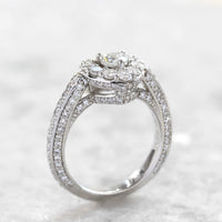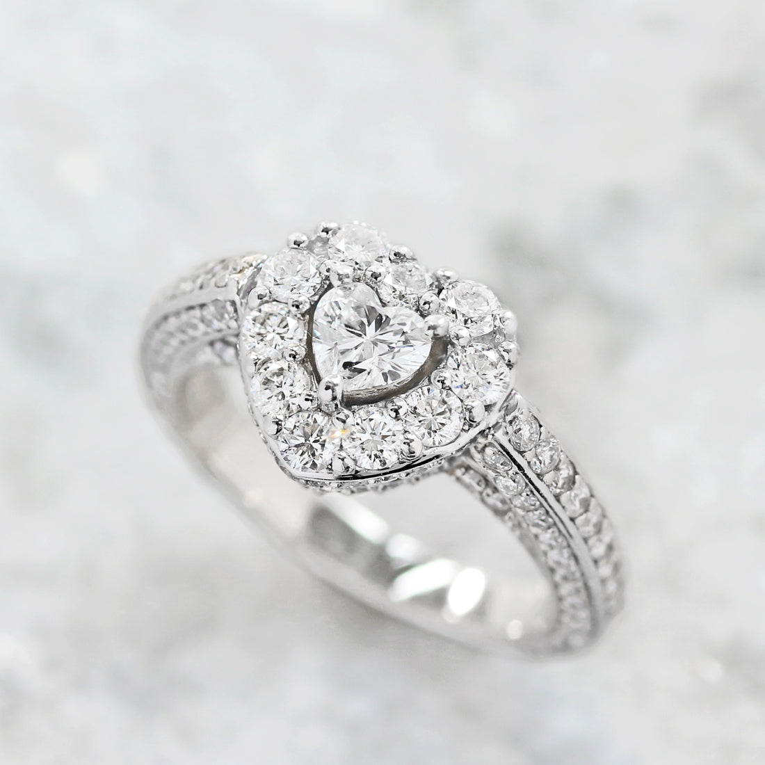 どこから見ても眩い虹色の煌きを放つハートシェイプカットダイヤモンドリング。