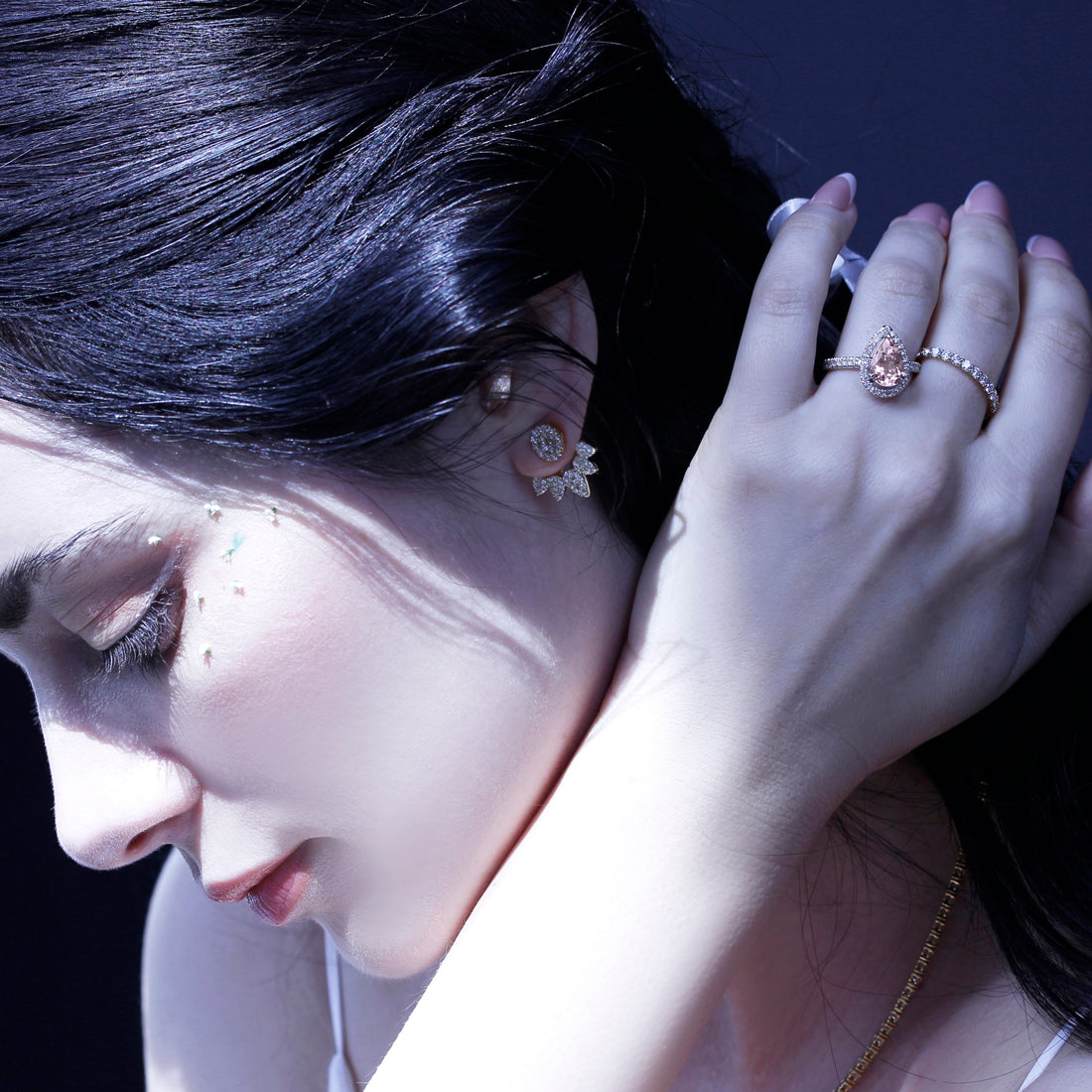 みずみずしくすっきりとした透明度に優しいピンクのカラーが広がり、動かすたびに複雑なカット面から"鏡の世界"のような奥行きある煌めきが踊る、非常に美しい逸品です。