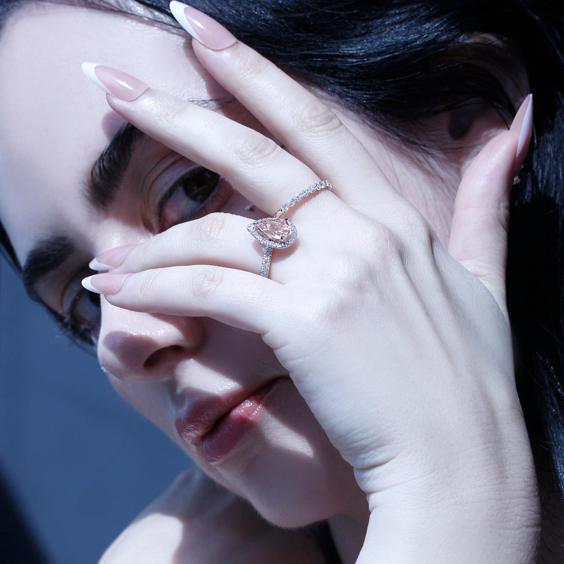 朝露のようなペアシェイプ(ティアドロップカット)のモルガナイトリング。