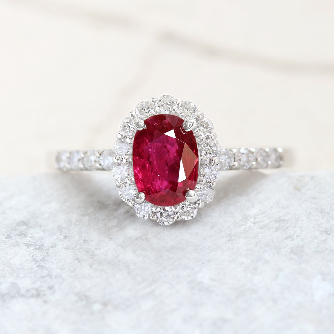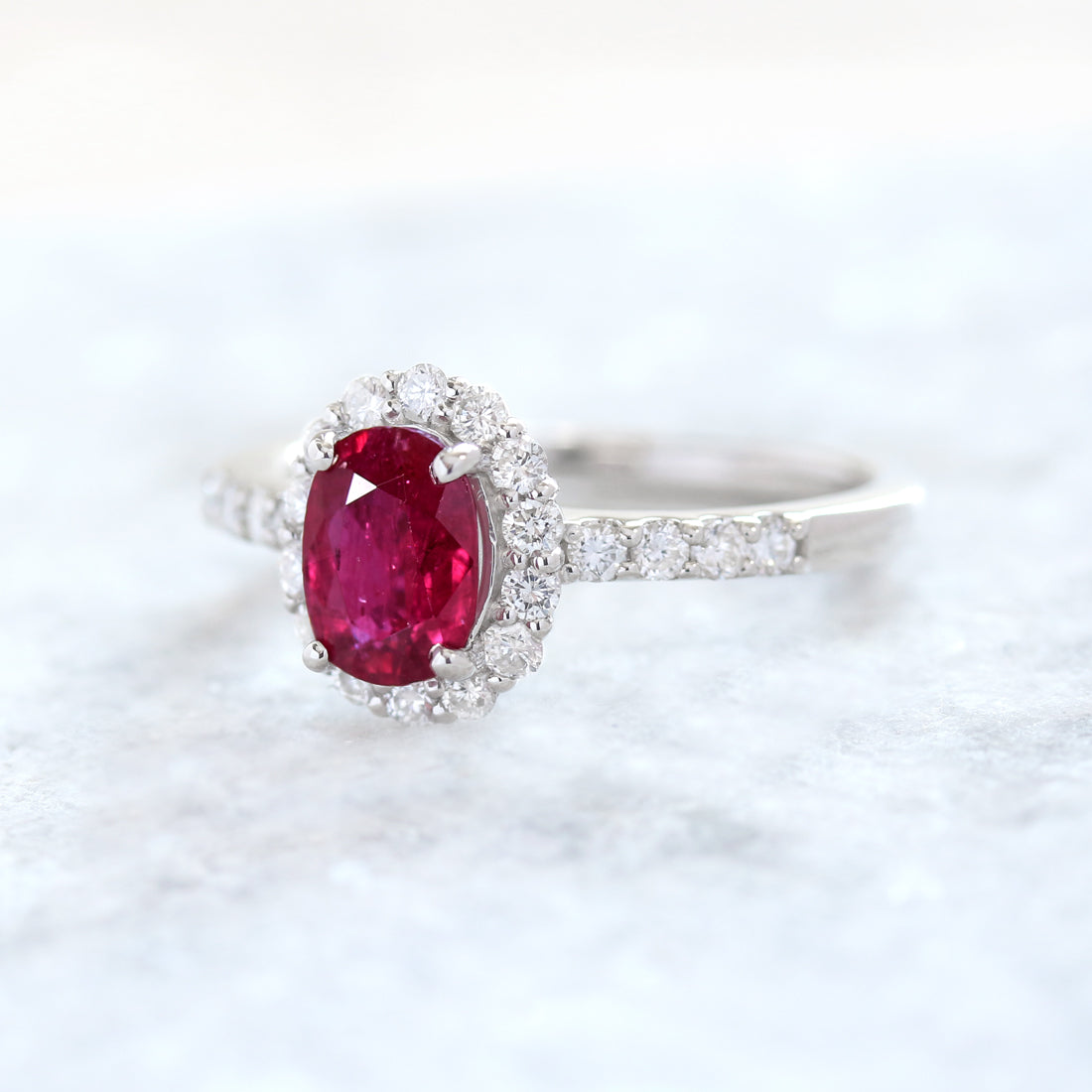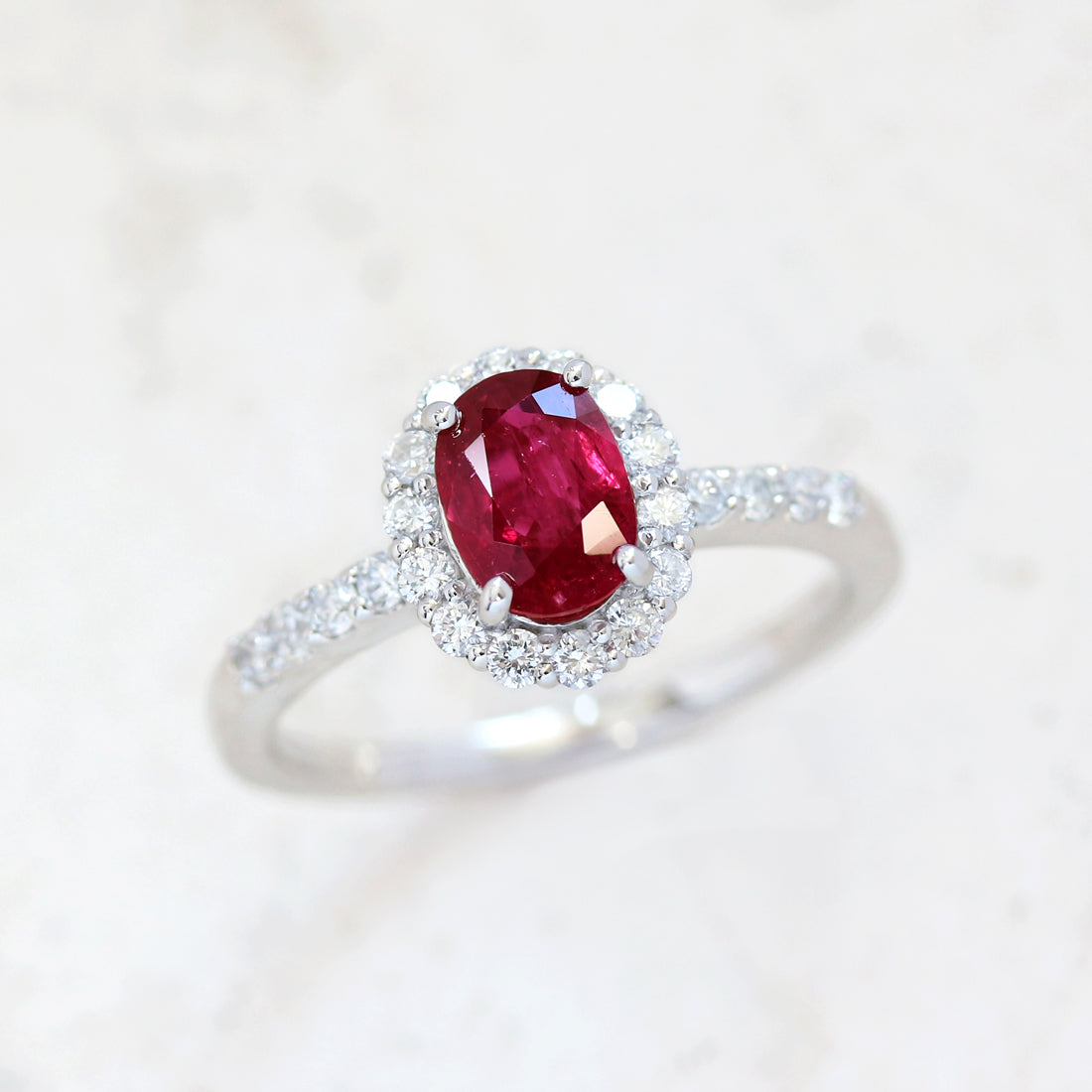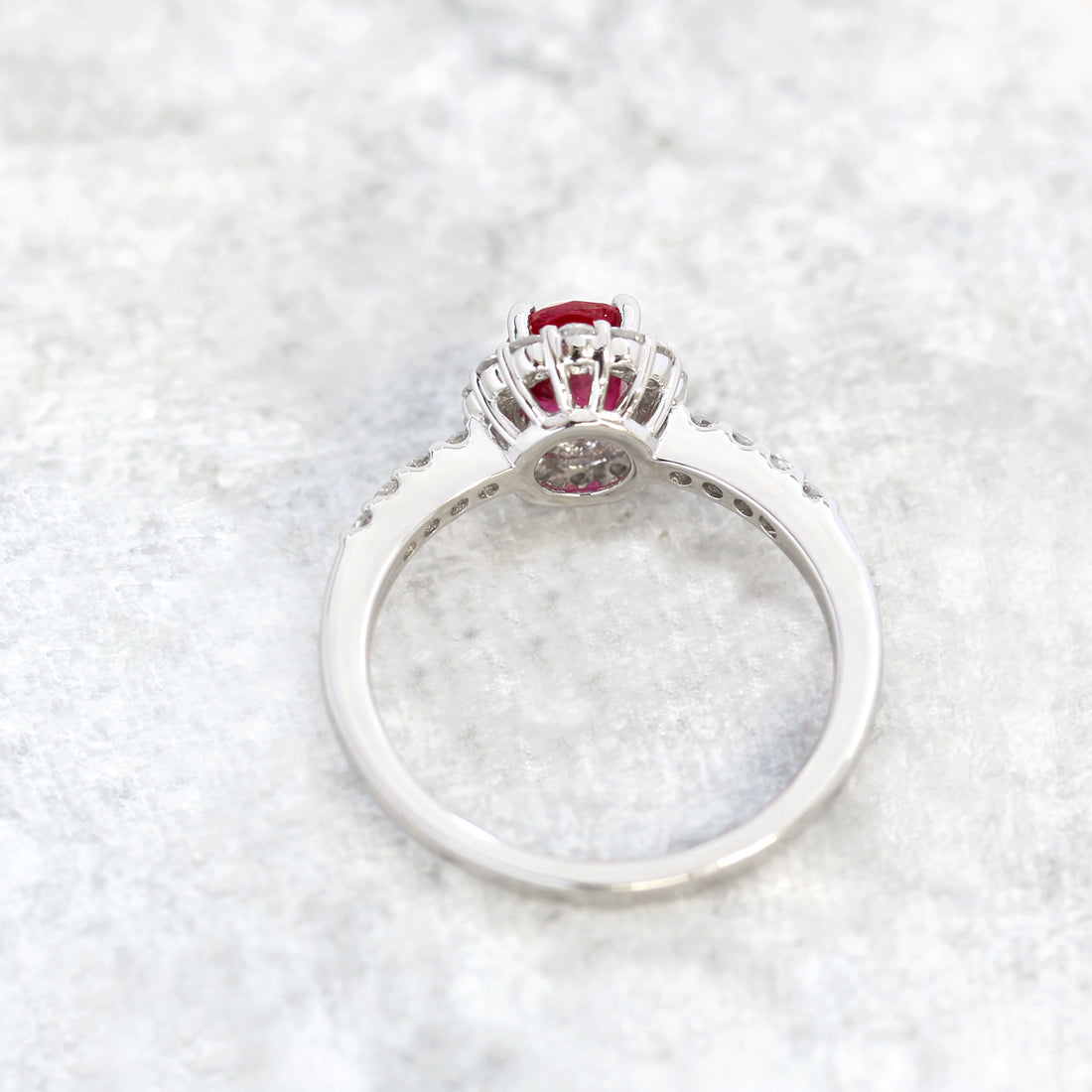 まばゆい輝きのメレダイヤモンドが第二の主役としてルビーの存在感を引き立ててくれる逸品です。