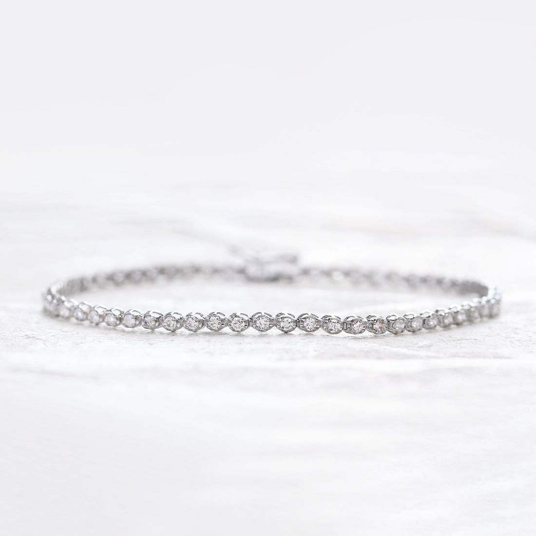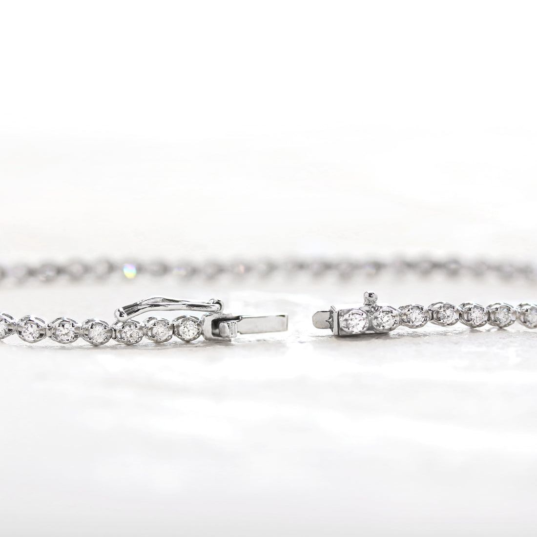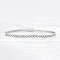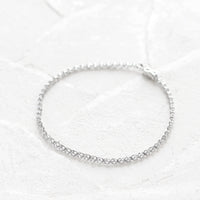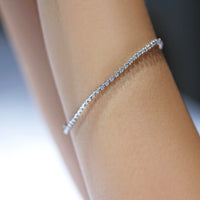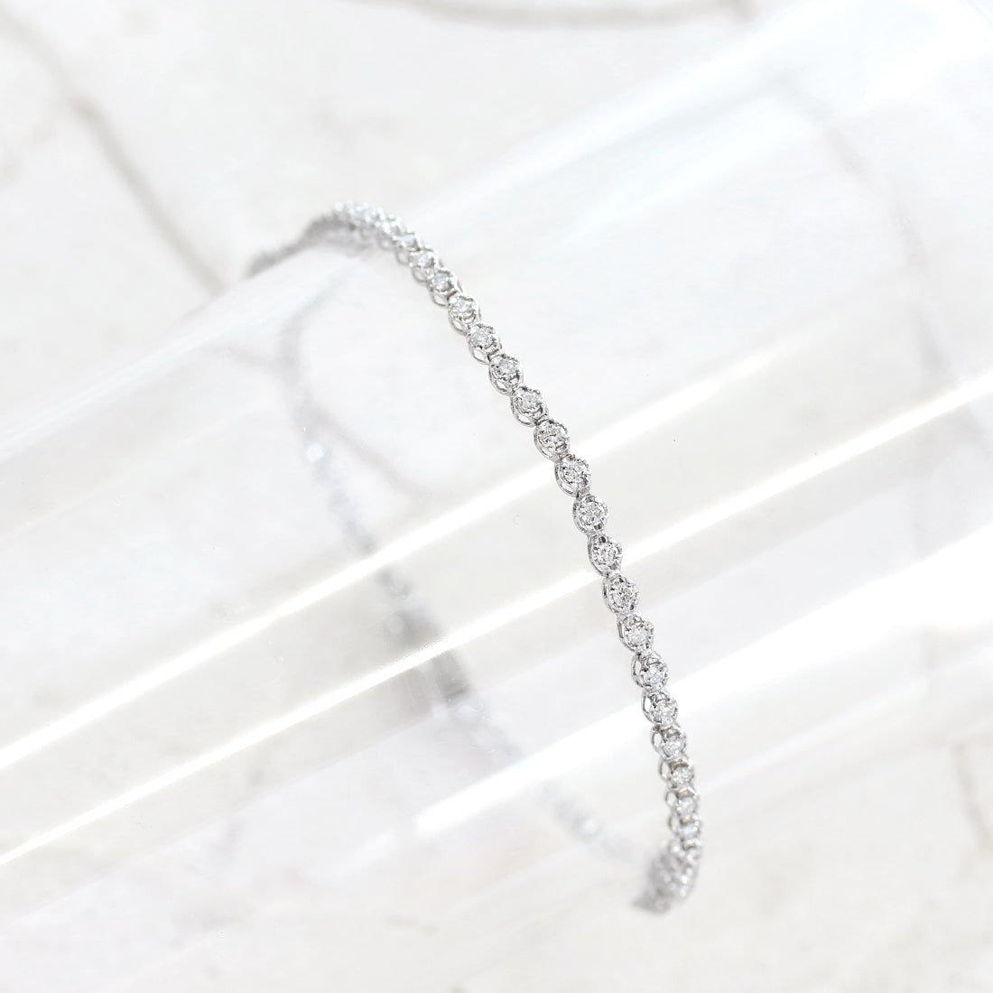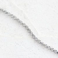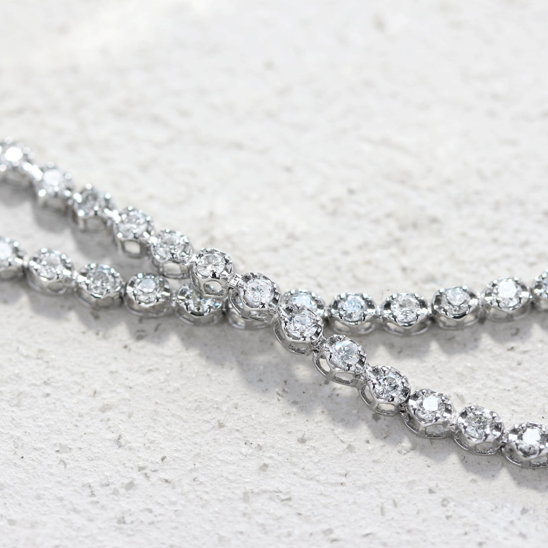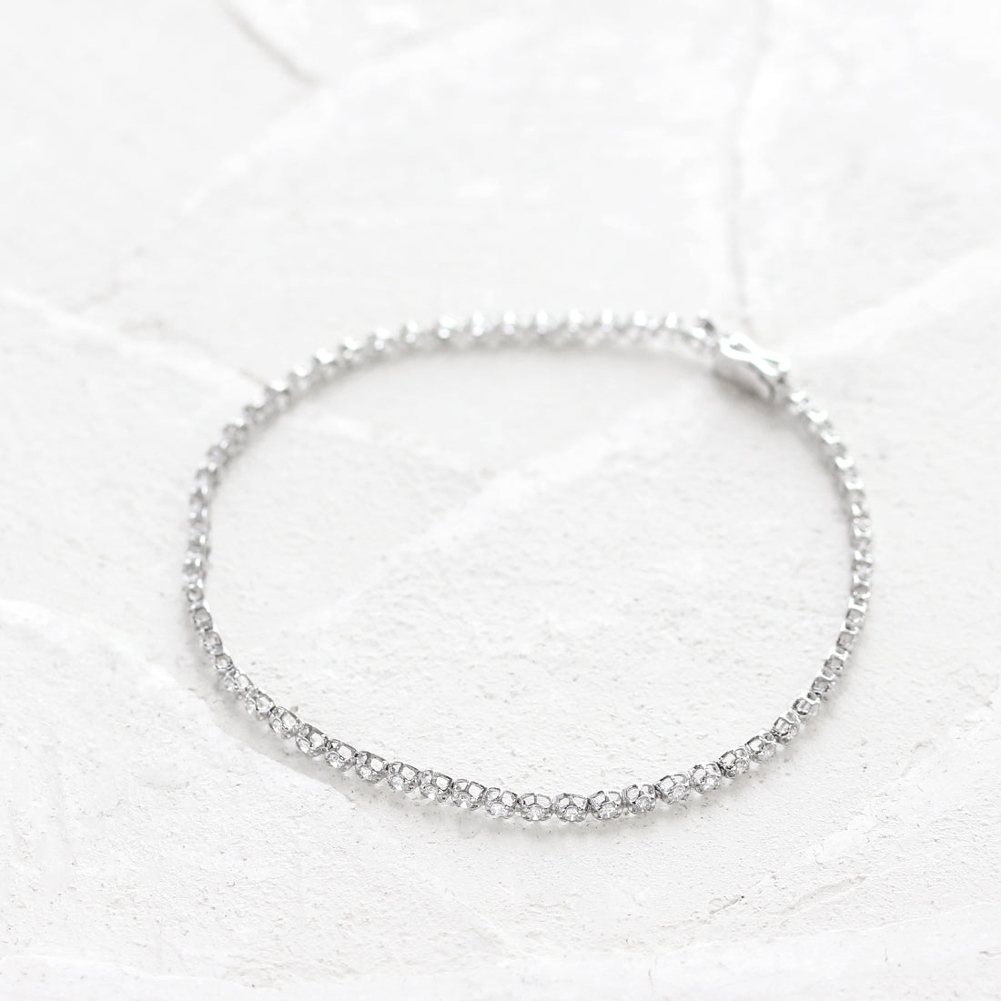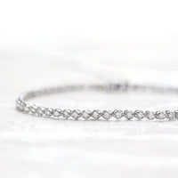 繊細なサイズのダイヤモンドを贅沢に繋げたフルダイヤモンドブレスレット。まるで星を散りばめたように、ひと粒ひと粒が光を受けて美しく瞬き、虹色のファイアが幻想的なきらめきを添えています。どんなコーディネートにもなじむ華奢なシルエットは、普段使いはもちろん重ね付けにもおすすめです。