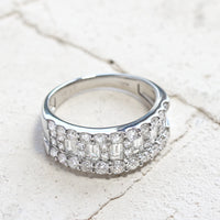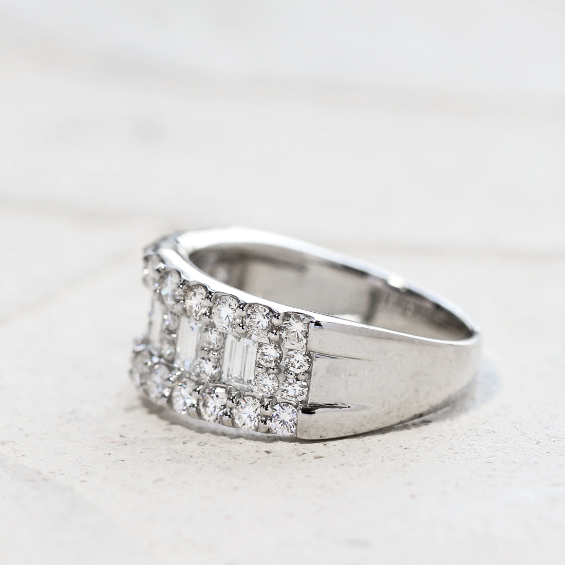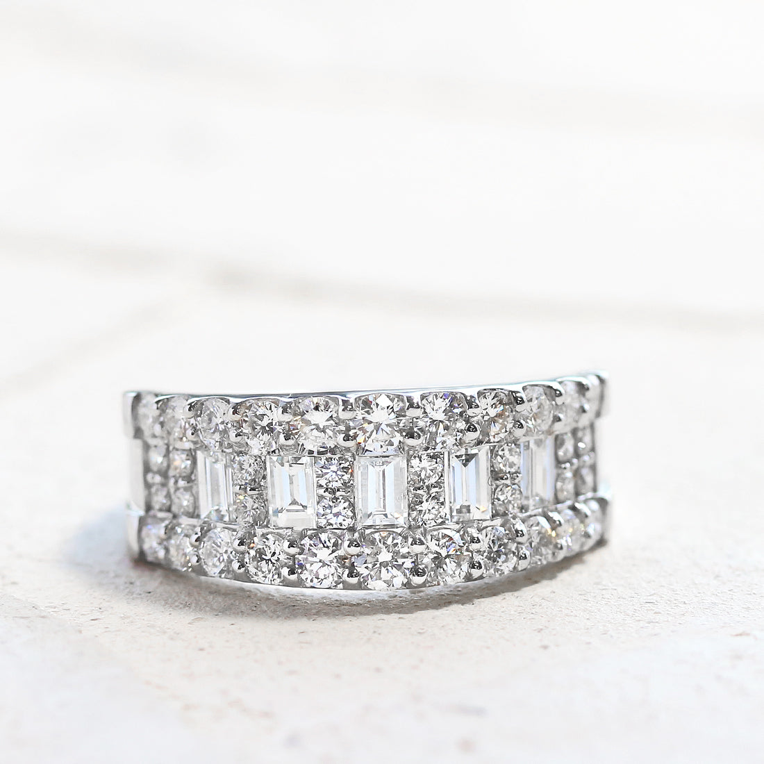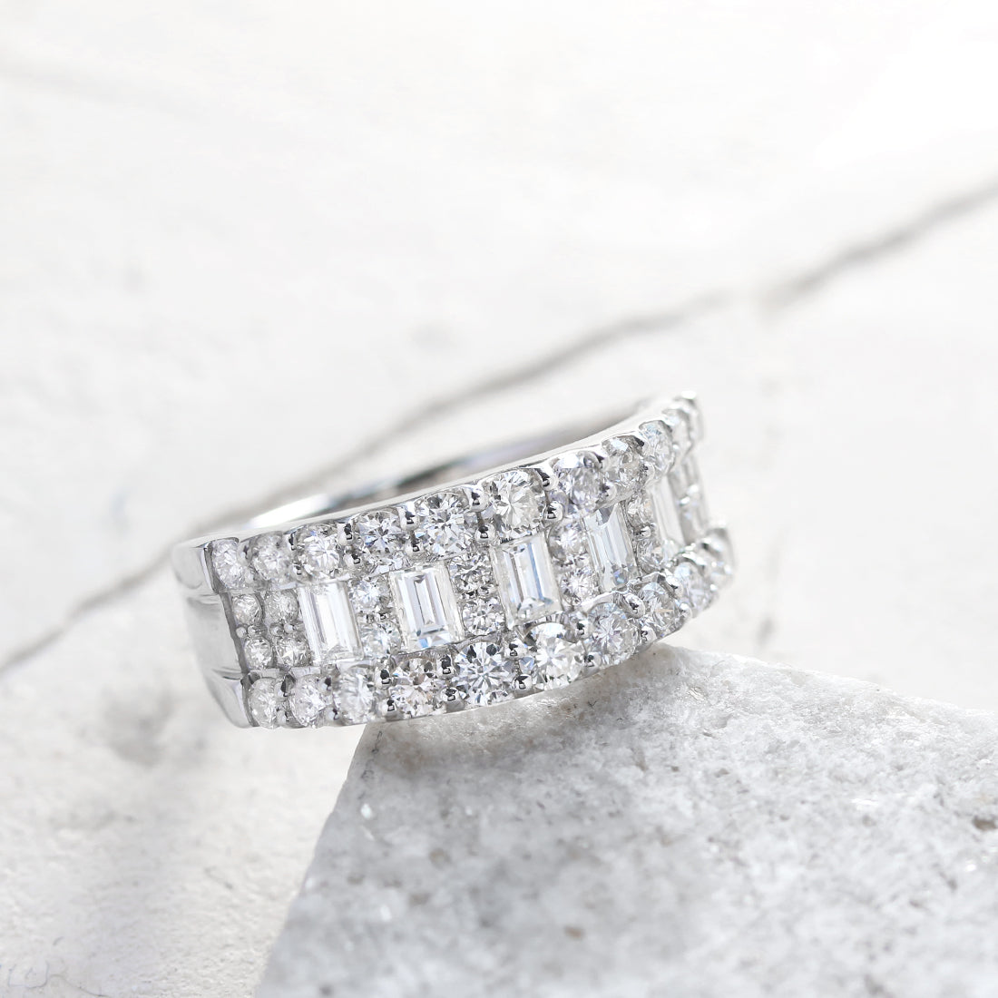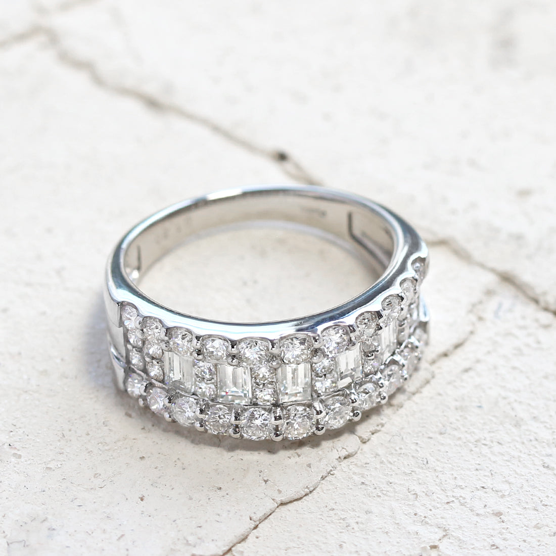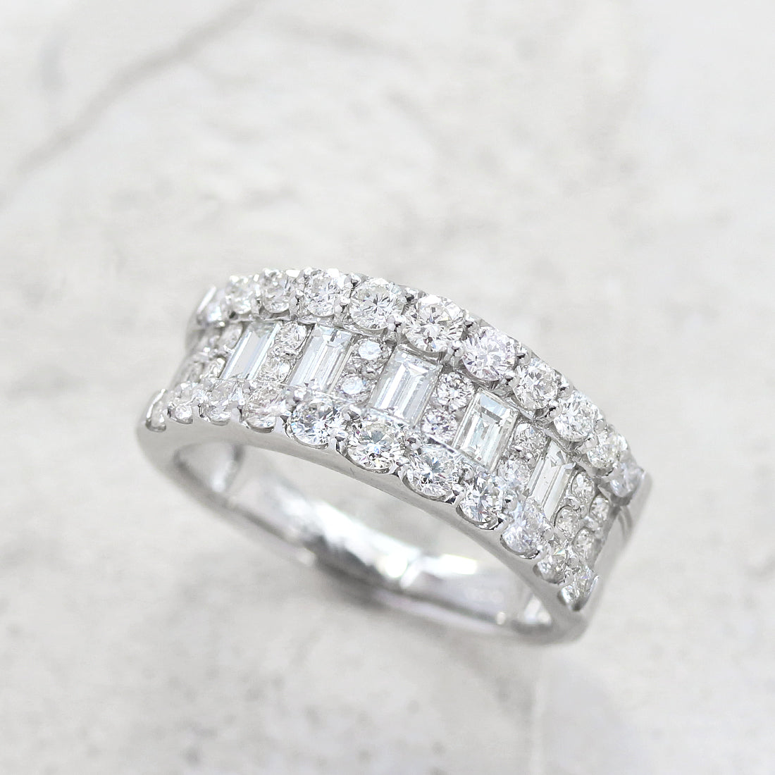 中央にはラウンドカットとバゲットカットのダイヤモンドを並べ、光を受けるたびにリズミカルに輝き、立体感と華やかさを演出します。