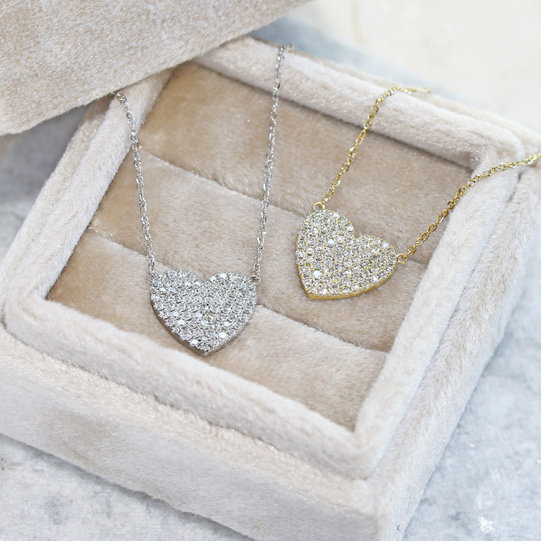 透明感溢れるダイヤモンドを敷き詰めたハートが光を受けるたびに煌めき、胸元を華やかに演出します。