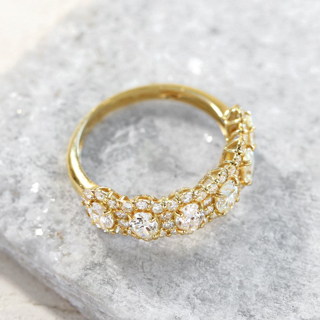 澄んだ光を伸びやかに放つオーバルカットダイヤモンドと、メレダイヤモンドの繊細な輝きが響き合うハーフエタニティリング。